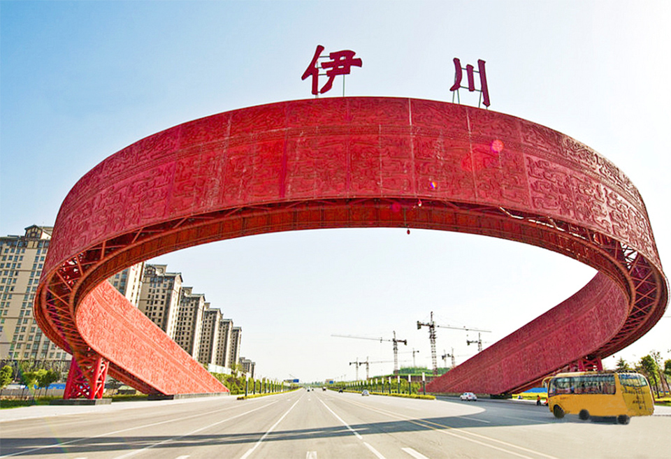 伊川县北出入口(北大门)工程,位于伊川县北出入口,本工程为钢结构体系(复杂大跨空间钢结构),整体跨度66米。工程于2012年11月30日开工,2014年5月10日竣工验收。